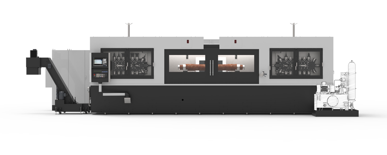Modulare Endenbearbeitungsmaschinen. Bis zu 3 m Wellenlänge, Parallel-Bearbeitung von 2 Seiten, Planschieber, kombinierbar mit Bündellader und Säge, Drehen – Fräsen – Bohren und Gewinden
